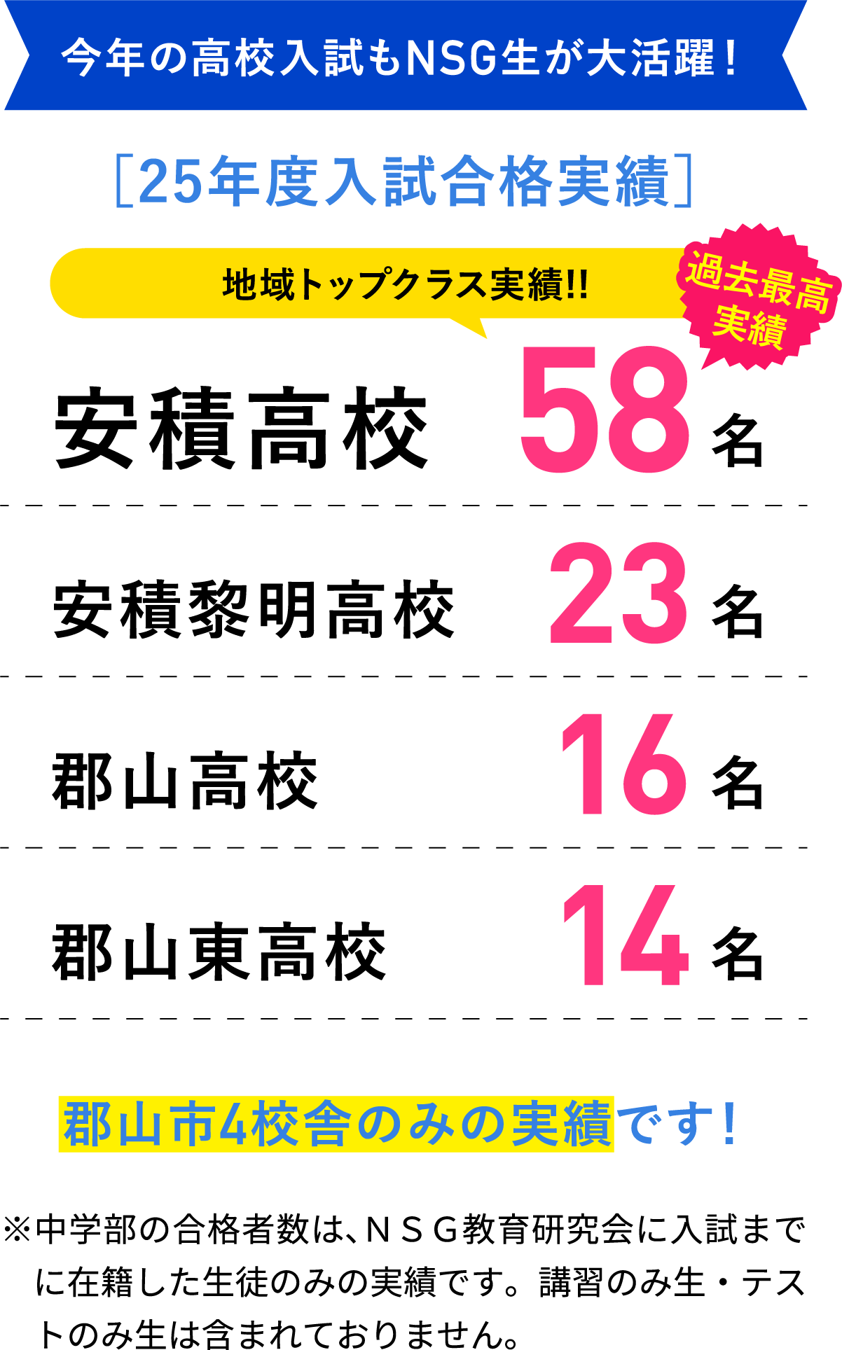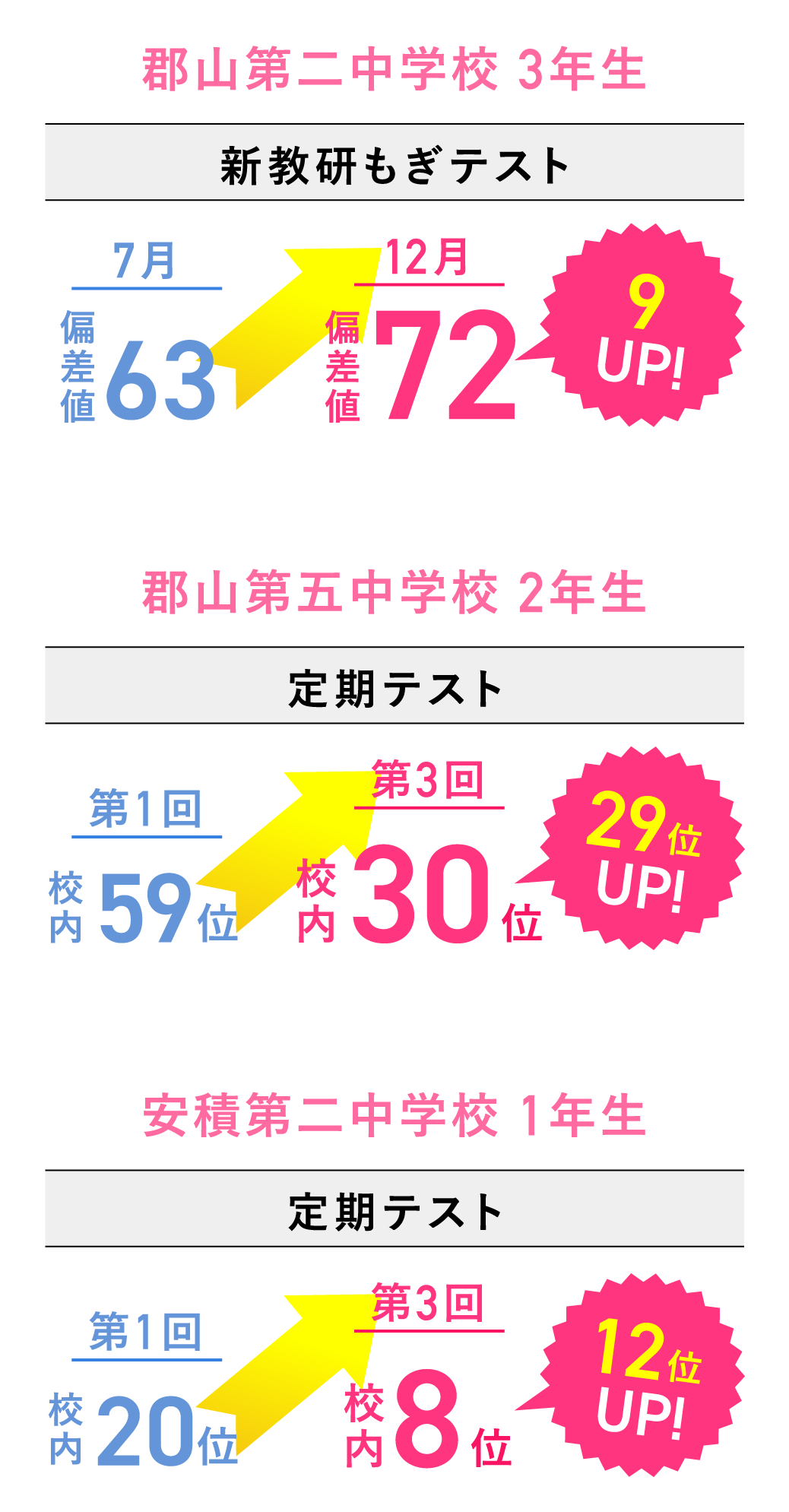 福島の中学・高校入試傾向を熟知した受験のプロ講師がキミのランクアップを徹底的にサポートします。質問対応や個別相談を通して一人ひとりのつまづきポイントを見逃しません!